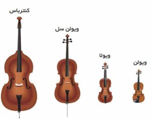 خانواده ویولن شامل ویولن، ویولا، ویولنسل و کنترباس است که هرکدام محدوده صوتی و نقش اجرایی متفاوتی در ارکستر دارند. ویولن بهدلیل گستره صوتی بالا و انعطافپذیری در اجرا، معمولاً نقش ملودیک و سولو را بر عهده دارد.